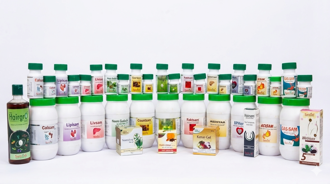 Samyak Herbal presents an extensive portfolio of Ayurvedic wellness products thoughtfully developed to address a wide range of health concerns through time-tested herbal formulations. The product range includes specialized tablets such as Acisam, BPHurb, Calsam, Countsam, Gassam, Itchsam, Kofsam, Livsam, Hemepure, Medhyam, Neem Guduchi, and Raktsam, each designed to support key bodily systems including digestion, metabolism, liver function, immunity, respiratory health, skin care, blood purification, and overall vitality. In addition to these internal wellness solutions, Samyak offers Surech Powder for digestive balance, as well as dedicated hair-care solutions like Hairgro Tablets and Hairgro Oil that promote hair strength and scalp health. The range is further complemented by topical formulations such as Shina Hair Gel and Shina Kesar Gel, crafted to enhance personal care through natural ingredients. Rooted in classical Ayurvedic principles and refined for modern lifestyles, Samyak Herbal products reflect a commitment to purity, effectiveness, and holistic well-being, making them suitable for daily health maintenance and long-term wellness support.